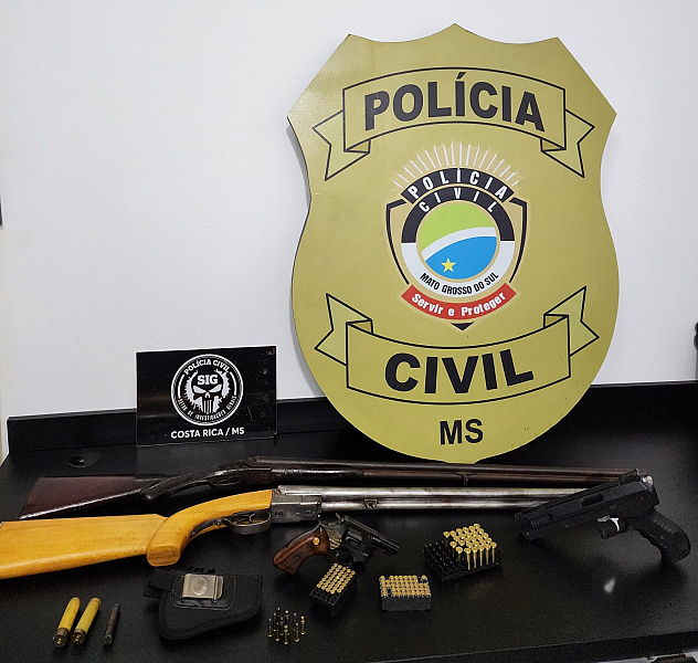 Na última quarta-feira (26), a Polícia Civil, por meio da Delegacia de Costa Rica, conduziu uma operação para cumprir um mandado de busca e apreensão. A ação resultou na apreensão de um revólver, duas espingardas e várias munições. No momento da operação, o alvo não estava presente na residência.