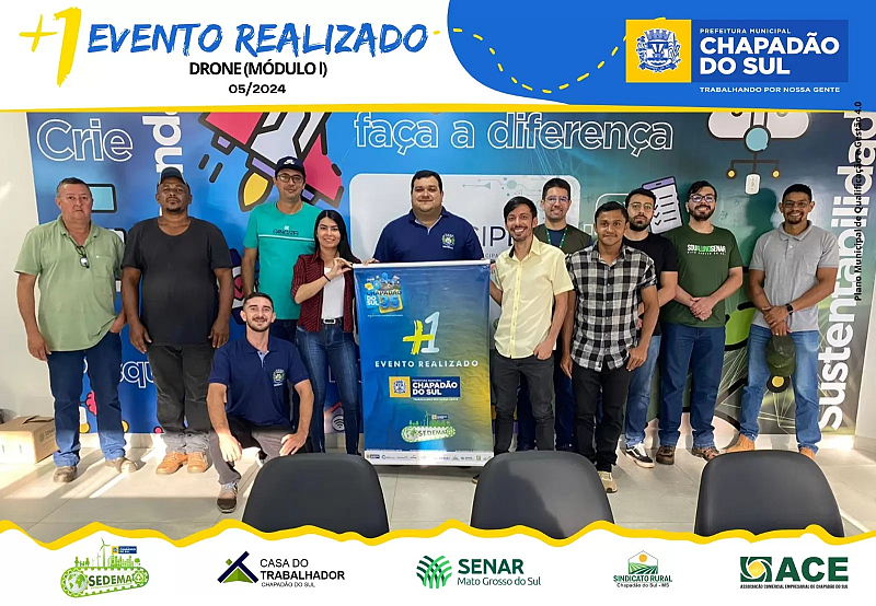 Em uma iniciativa voltada para o avanço tecnológico e capacitação profissional, a Prefeitura de Chapadão do Sul, em conjunto com a Secretaria de Desenvolvimento Econômico e Meio Ambiente (SEDEMA), a Casa do Trabalhador, AGIPEQ, o Sindicato Rural local, SENAR-MS e a Associação Comercial Empresarial (ACE), promoveu o curso gratuito “Operação de Aeronave Remotamente Pilotada (Drone) – Módulo I”. O curso ocorreu nos dias 08 e 09 de maio, nas instalações da AGIPEQ no Paço Municipal.