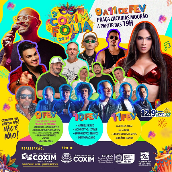 Fevereiro chegou e com ele a expectativa para o maior carnaval de rua da região norte: o 2º Coxim Folia. O evento, marcado para os dias 9, 10 e 11 de fevereiro na Praça Zacarias Mourão (Pé de Cedro), promete três dias de muita folia, música, desfile de blocos e diversão para toda a família.
