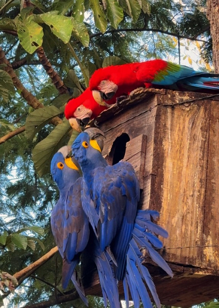 Um registro inusitado foi feito recentemente na Estância Mimosa, atrativo de cachoeiras localizado em Bonito (MS): araras-azuis e araras-vermelhas disputando um ninho artificial instalado na propriedade. A cena chama atenção pela beleza e comportamento natural das aves, mas também evidencia o sucesso das ações de conservação em curso no local.