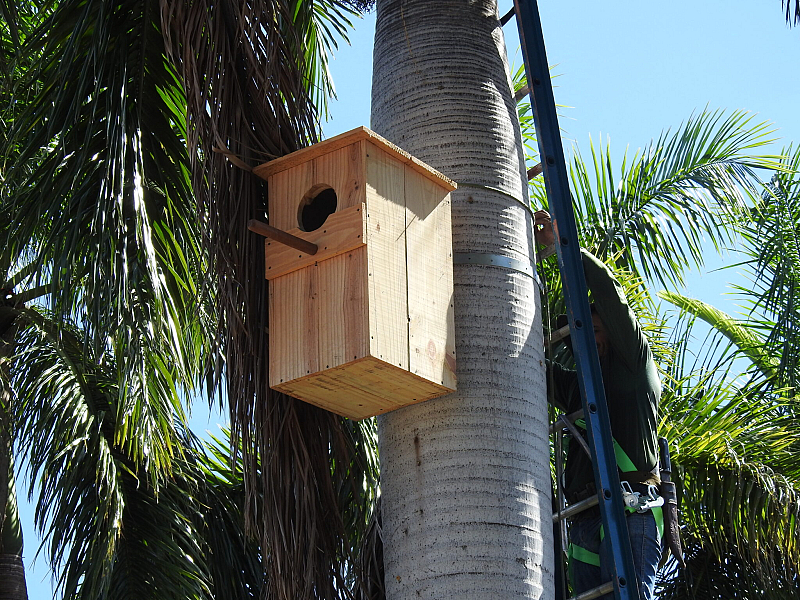 Um dos ninhos implantados em 2023, localizado na palmeira da Semdema, já está sendo ocupado por um casal de Araçari-Castanho, uma espécie de tucano menor que mede cerca de 43 centímetros de comprimento e pesa entre 220 e 310 gramas.