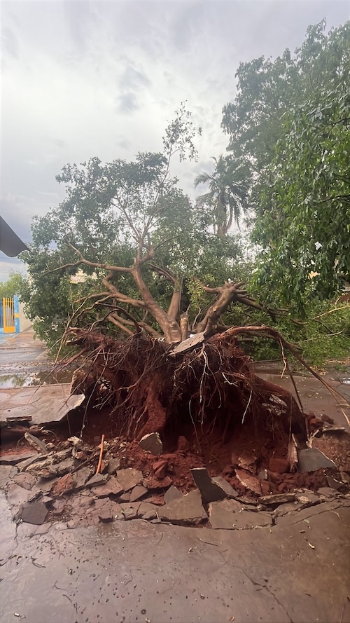 A severidade climática, com registro até de queda de granizo em algumas regiões, nesse final de semana, provocou danos na rede elétrica e interrupção no fornecimento de energia de forma parcial em alguns bairros, onde a rede foi atingida por galhos de árvores e outros objetos arremessados pelo vento.
