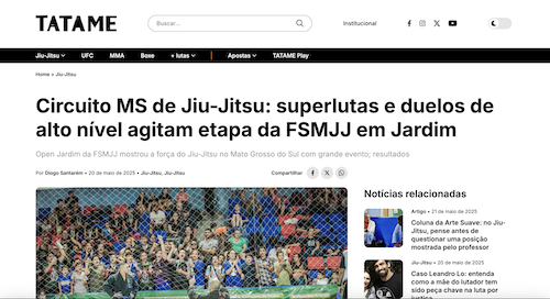 A quarta etapa do Circuito MS de Jiu-Jitsu 2025, realizada em Jardim no sábado passado (17 de maio), é destaque na imprensa esportiva nacional esta semana. Válido pela quarta etapa do Circuito MS de Jiu-Jitsu 2025, o evento reuniu quase 600 atletas de diferentes cidades do Mato Grosso do Sul e consagrou vários campeões, do mirim ao master.