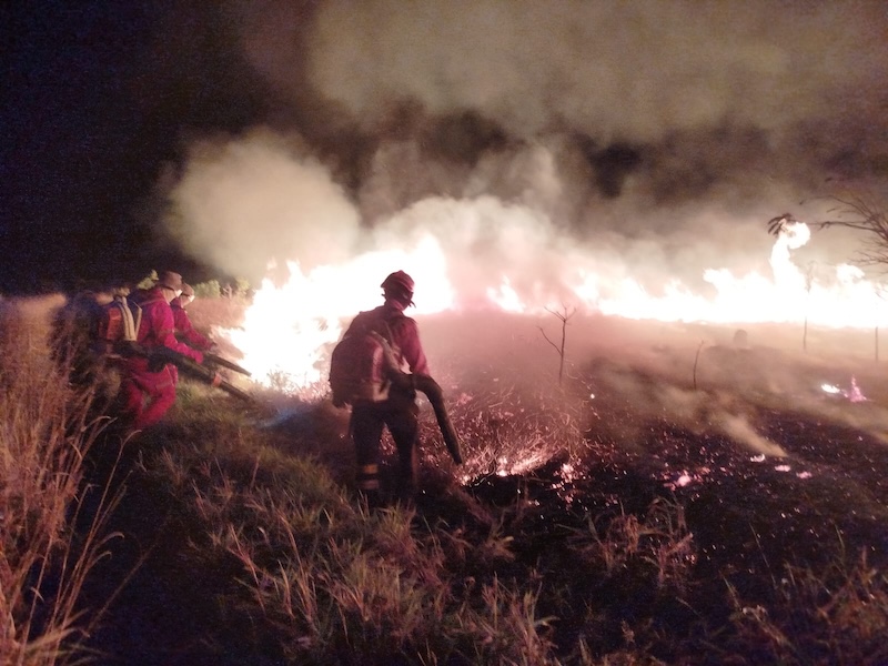 Para tentar conter o avanço das chamas, já foram abertos mais de 50 quilômetros de aceiros com maquinário pesado, além de barreiras manuais feitas por brigadistas.