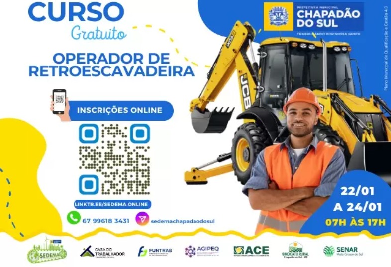 Oportunidade única para quem busca aprimorar suas habilidades no mercado de trabalho: a Prefeitura de Chapadão do Sul, em parceria com entidades locais como o Sindicato Rural, a Casa do Trabalhador, a ACE e o SENAR, está promovendo o curso gratuito "Operador de Retroescavadeira (Linha Amarela)" por meio da SEDEMA – Secretaria de Desenvolvimento Econômico e Meio Ambiente.