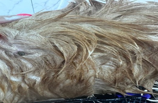 O laudo da médica veterinária revelou que o cão estava infestado de carrapatos, tinha feridas pelo corpo, dermatite e estava subnutrido, confirmando os maus-tratos devido ao abandono e à falta de cuidados veterinários.