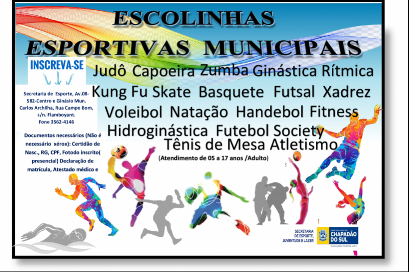 A Prefeitura de Chapadão do Sul, através da Secretaria de Esporte, Juventude e Lazer, informa que as aulas nas Escolinhas Esportivas Municipais começam na próxima segunda-feira (21 de fevereiro).