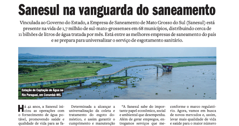 A gestão de excelência da Sanesul, concessionária responsável pelo abastecimento de água tratada e pelo tratamento do esgoto doméstico em 68 municípios de Mato Grosso do Sul, voltou às manchetes de importantes e influentes órgãos de imprensa do país.