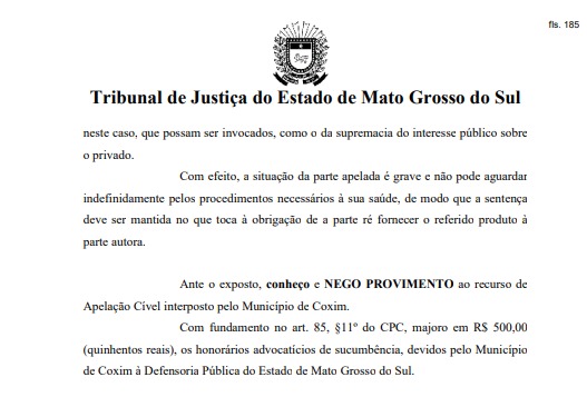 Diante dos argumentos apresentados, o TJMS decidiu por manter a sentença original, obrigando o município de Coxim a fornecer as fraldas geriátricas à paciente. A decisão foi unânime entre os desembargadores, que também majoraram os honorários advocatícios de sucumbência em R$ 500,00, a serem pagos pelo município à Defensoria Pública do Estado de Mato Grosso do Sul.
