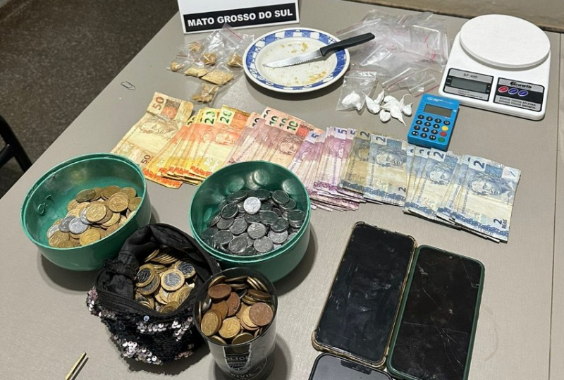 No local, os policiais encontraram porções de cocaína e pasta base já fracionadas para venda, além de 80 sacos plásticos tipo “zip”, usados para embalar entorpecentes, uma máquina de cartão, quatro celulares e R$ 801 em dinheiro trocado — indício comum do comércio de drogas.
