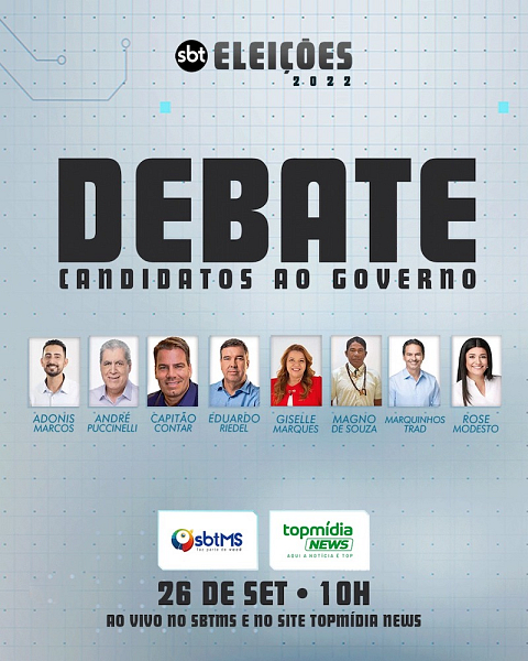 Os candidatos ao cargo de governador de Mato Grosso do Sul Adonis Marcos (Psol), André Puccinelli (MDB), Capitão Contar (PRTB), Eduardo Riedel (PSDB), Giselle Marques (PT), Marquinhos Trad (PSB), Magno Souza (PCO) e Rose Modesto (UB) participam, na próxima segunda-feira (26 de setembro), às 10h da manhã, do Debate TopMídiaNews/SBT-MS.