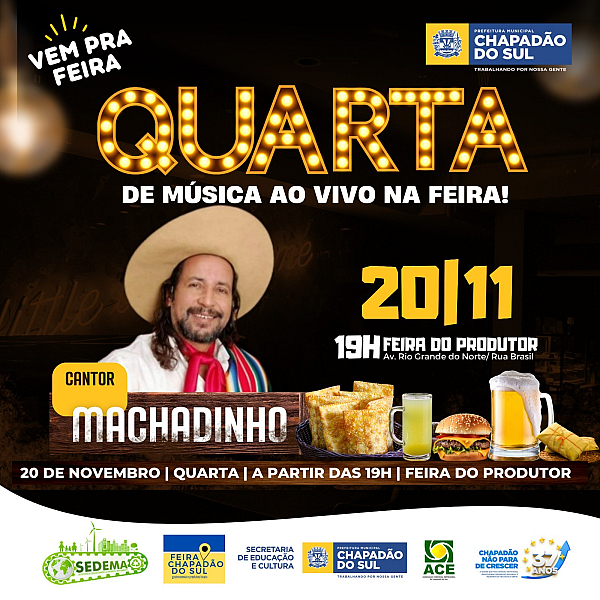A Prefeitura de Chapadão do Sul realizará na próxima quarta-feira, 20 de novembro, uma edição especial da Feira do Produtor, intitulada "Quarta Feira Cultural", com o objetivo de fomentar o comércio local, valorizar pequenos negócios e oferecer cultura e lazer à população. O evento acontecerá a partir das 19h na Feira do Produtor, localizada na Avenida Rio Grande do Norte, esquina com a Rua Brasil.