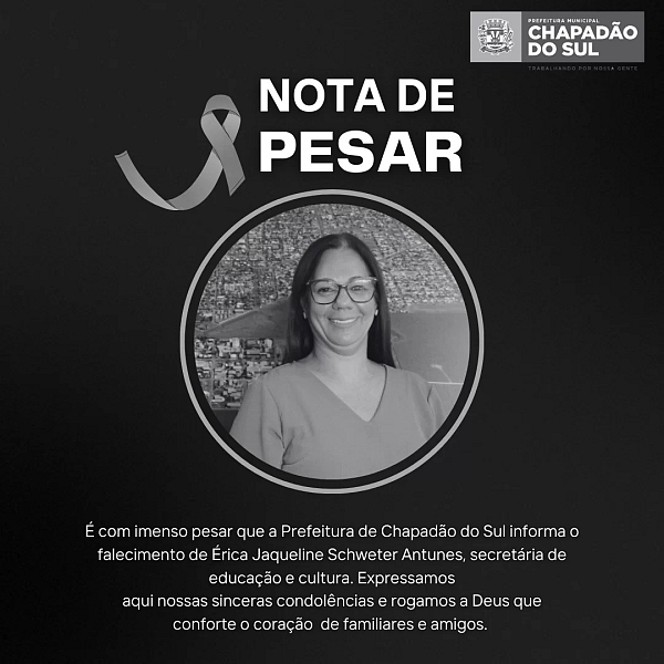 A cidade de Chapadão do Sul está de luto com o falecimento de Érica Jaqueline Schweter Antunes, secretária de Educação e Cultura, ocorrido na segunda-feira (21). Em reconhecimento à sua trajetória e impacto no desenvolvimento da educação local, a Prefeitura, liderada pelo prefeito João Carlos Krug, decretou três dias de luto oficial e suspendeu as atividades públicas e escolares até quinta-feira (24).