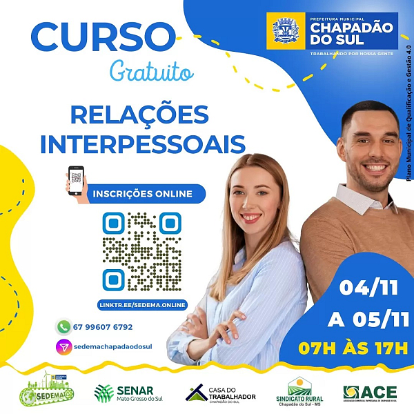 A Prefeitura de Chapadão do Sul, por meio da SEDEMA e em parceria com o Sindicato Rural, SENAR/MS e ACE, promoverá nos dias 4 e 5 de novembro o Curso de Relações Interpessoais. O objetivo é desenvolver habilidades essenciais para melhorar a convivência pessoal e profissional, promovendo uma reflexão sobre o relacionamento consigo mesmo e com os outros. A capacitação terá 16 horas de duração e será realizada na Sala de Treinamentos da Rodoviária, das 7h às 17h. A inscrição pode ser feita pelo link: https://linktr.ee/sedema.online.