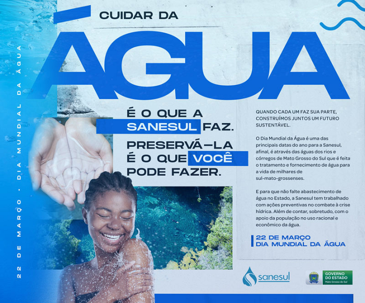 “Neste Dia Mundial da Água, queremos reforçar a importância desse recurso para as famílias sul-mato-grossenses. Diariamente, trabalhamos com ações preventivas que garantem a segurança hídrica no abastecimento, por isso contamos com a atenção redobrada da população contra o desperdício e o mau uso da água tratada. Cuidar é o que a Sanesul faz, preservá-la é o que você, consumidor, pode fazer”, sugere o dirigente, ao se orgulhar pelo fato de que o sistema de abastecimento já é universalizado no Estado.