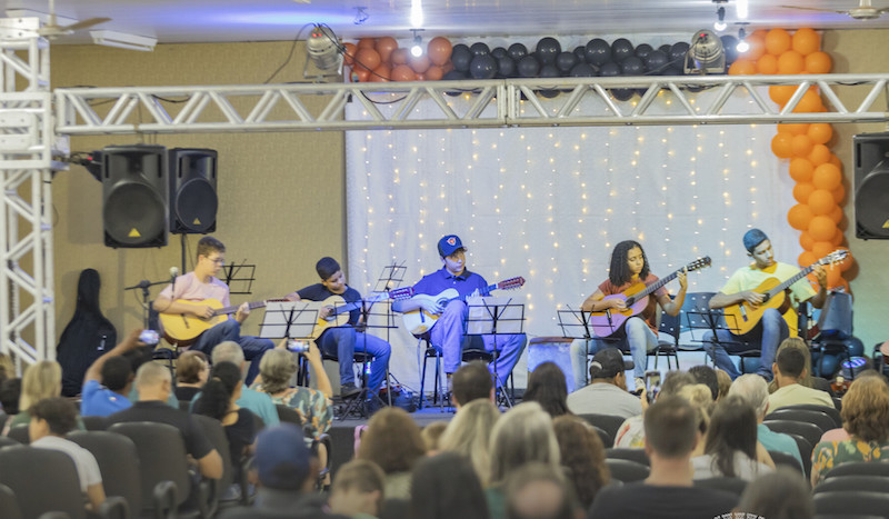 Com um repertório variado, o Projeto levou ao palco canções nacionais e internacionais, abrindo o evento com uma linda apresentação dos instrutores de cordas, Marcos, Alisson e Sérgio.