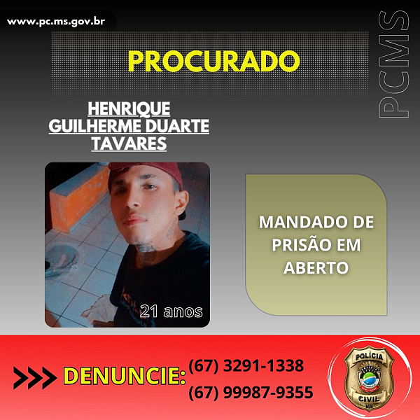 A Polícia Civil de Mato Grosso do Sul está à procura de Henrique Guilherme Duarte Tavares, de 21 anos, que se encontra foragido desde o início das investigações por maus-tratos, ocorridos em Coxim/MS no dia 9 de outubro de 2024.