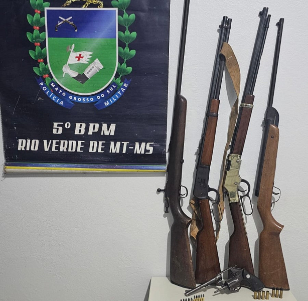No local, os policiais apreenderam um arsenal composto por quatro armas longas, incluindo calibres .38 e .22, além de um revólver e diversas munições. O material foi apresentado às autoridades para as providências legais.