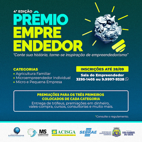 As inscrições para a edição do Prêmio Empreendedor de 2022 foram prorrogadas até o dia 28 de setembro, próxima quarta-feira. A premiação é realizada pela Prefeitura de São Gabriel do Oeste, por meio da Secretaria Municipal de Desenvolvimento Econômico e reconhece empreendedores que se destacam por suas histórias de inspiração e sistemas de gestão dos seus negócios.