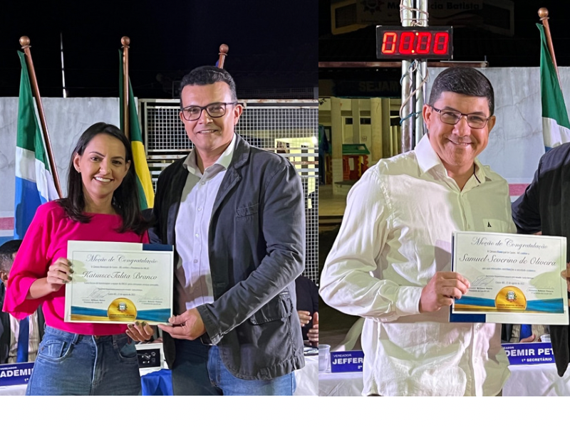 O vereador Carlos Henrique (MDB) homenageou, durante a sessão extraordinária de segunda-feira (29 de agosto), a diretora do Instituto Municipal dos Servidores de Coxim de Assistência Socia (IMCAS), Katiusce Talita Branco, e o radialista e empresário Samuel Oliveira.