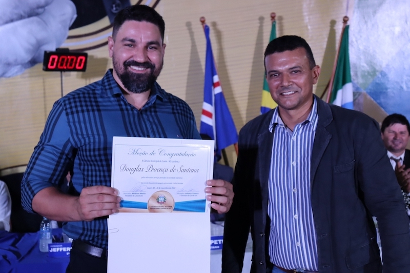 O vereador Carlos Henrique concedeu moção de congratulação ao professor Douglas Proença, durante sessão solene itinerante da Câmara Municipal de Coxim, ocorrida na noite de segunda-feira (12), na Praça Zacarias Mourão.